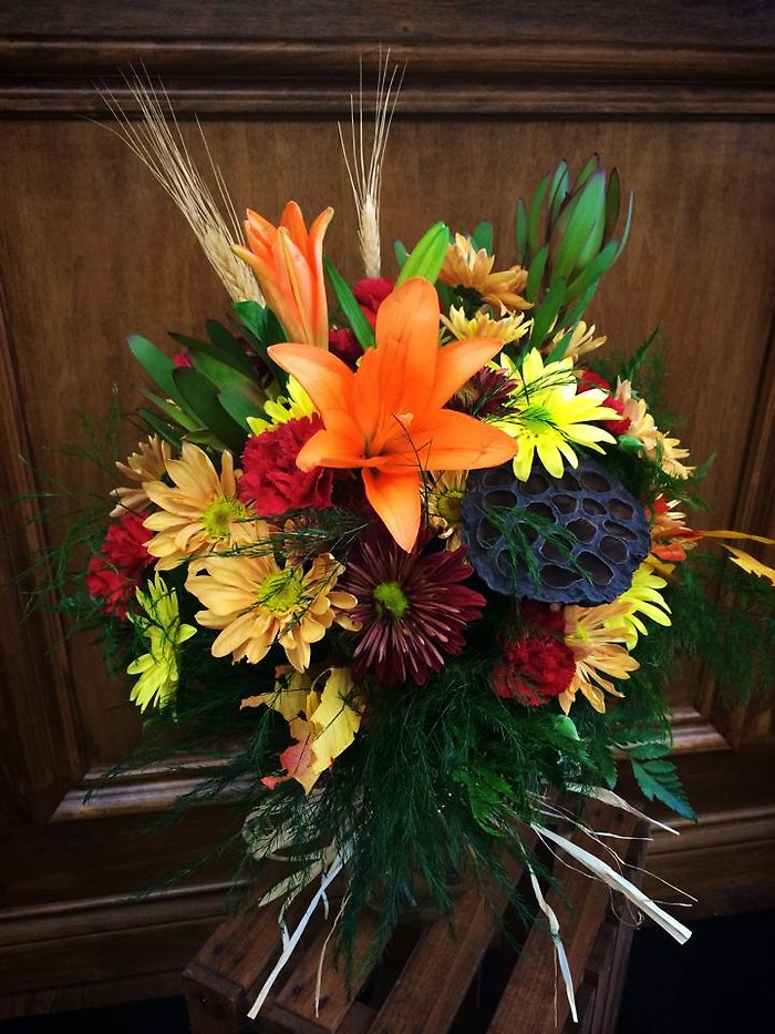 Beautiful fall mix for the season made in an 8 inch glass vase.